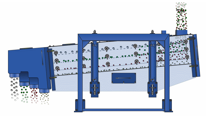 方形搖擺篩啟動后,篩機(jī)搖動體即篩箱在慣性力的作用下做前后往復(fù)運動,篩箱帶動篩面做周期性搖動,從而使篩面上的物料隨篩箱一同做定向跳躍式運動,期間,小于篩面孔徑的物料通過篩孔落到下層,成為篩下物,大于篩面孔徑的物料經(jīng)連續(xù)翻滾跳躍運動后從排料款排出,完成篩分工作。